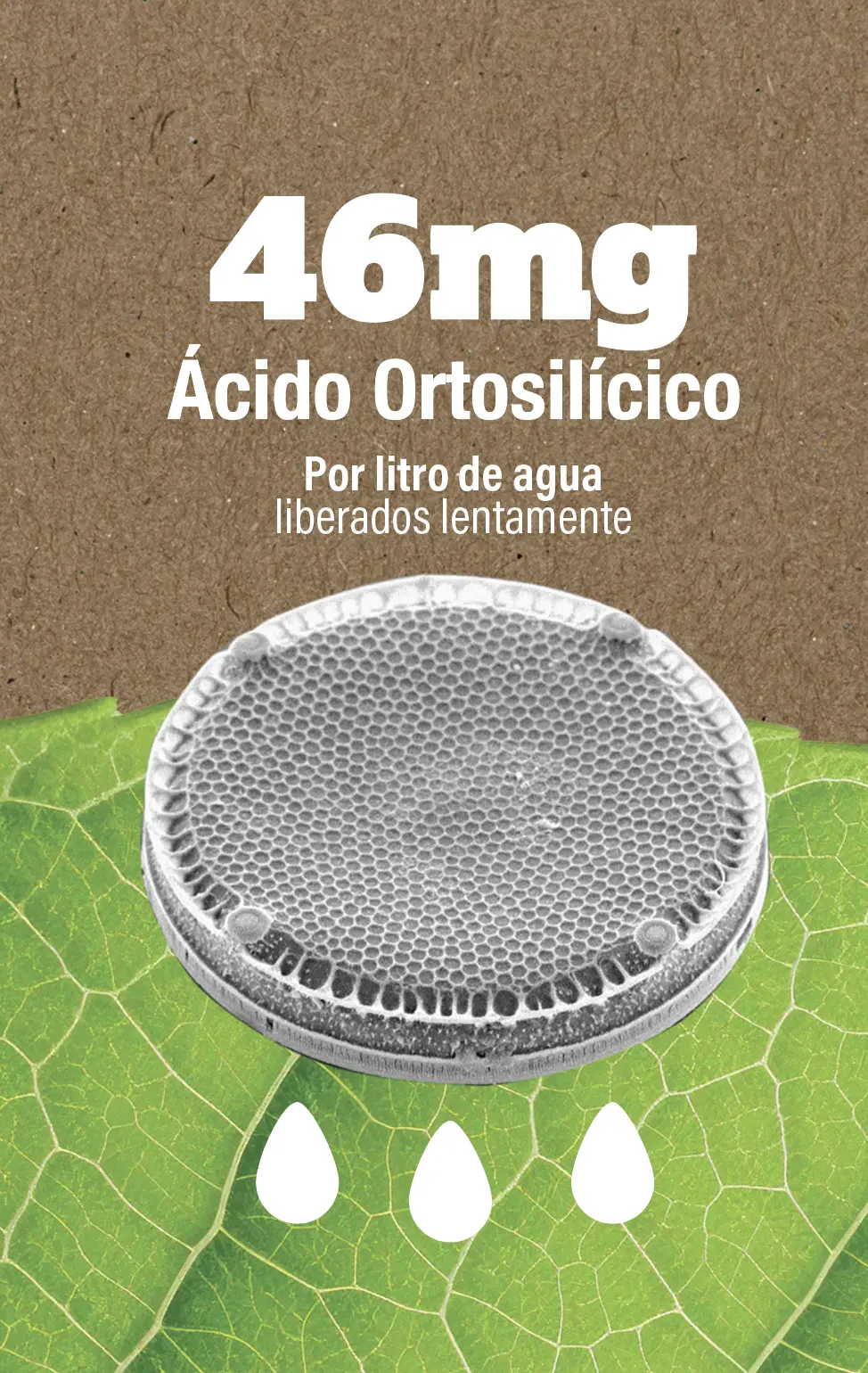 Cuando el dióxido de silicio de Diatomix (pureza al 92%) entra en contacto con el agua, el polvo empieza a convertirse en ácido ortosilícico (H₄SiO₄), la forma soluble y fácilmente asimilable de silicio por las plantas.