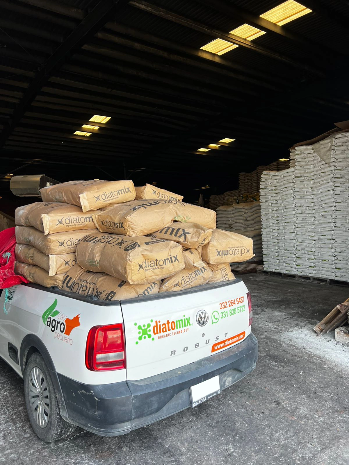 Diatomix original está empacado en bultos de 18 kg de papel kraft, por su densidad tiene una altura de 90 cm, la marca Diatomix está impresa directamente en el saco.