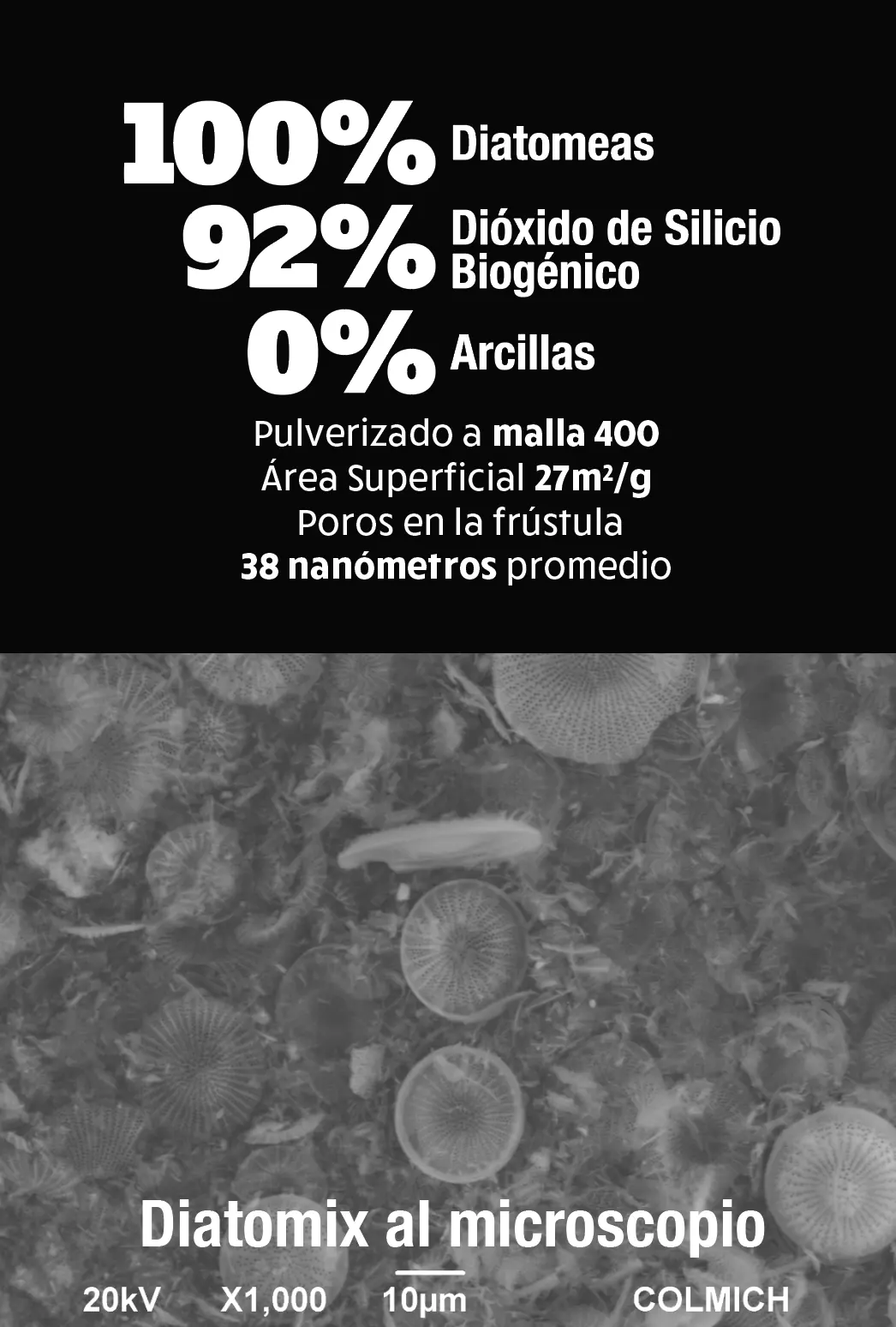 Diatomix es un polvo fino de color blanco, compuesto en un 92% por dióxido de silicio.